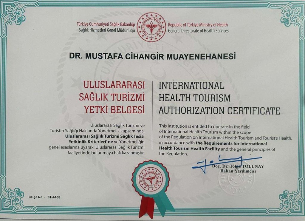 Tesisimiz, Uluslararası Sağlık Turizmi ve Turistin Sağlığı Hakkında Yönetmelik kapsamında, Uluslararası Sağlık Turizmi Sağlık Tesisi Yetkinlik Kriterleri’ne ve Yönetmeliğin genel esaslarına uyarak, Uluslararası Sağlık Turizmi faaliyetinde bulunmaya hak kazanmıştır.